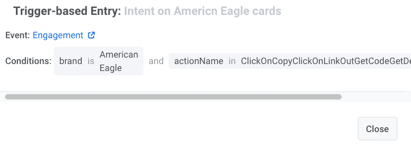 • Trigger-based entry: users enter the journey when they trigger the target Event with the specific Event attribute (for example, “brand: American Eagle”):