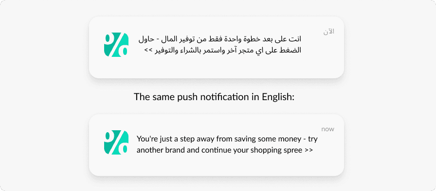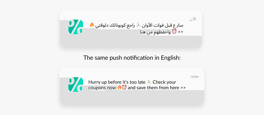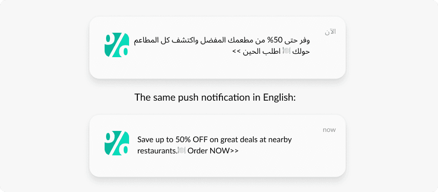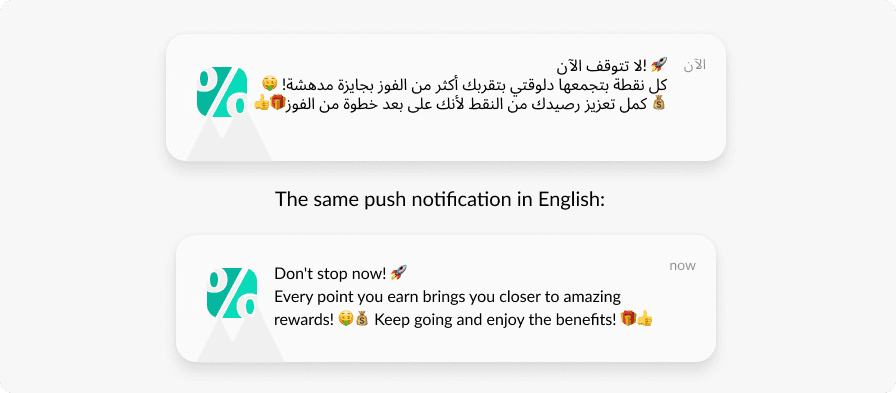 • Personalization: differentiating messages by language: if a user speaks Arabic, a message will be sent in Arabic; otherwise the message will be sent in English;