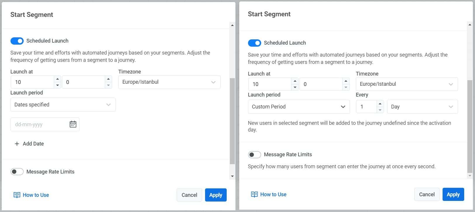 When enabled, the Scheduled Launch refreshes the segment prior to every scheduled entry and lets those users into the journey who got into the segment after it started the journey last time. Users who are traveling the journey at the moment of the repeated start don’t enter it again.